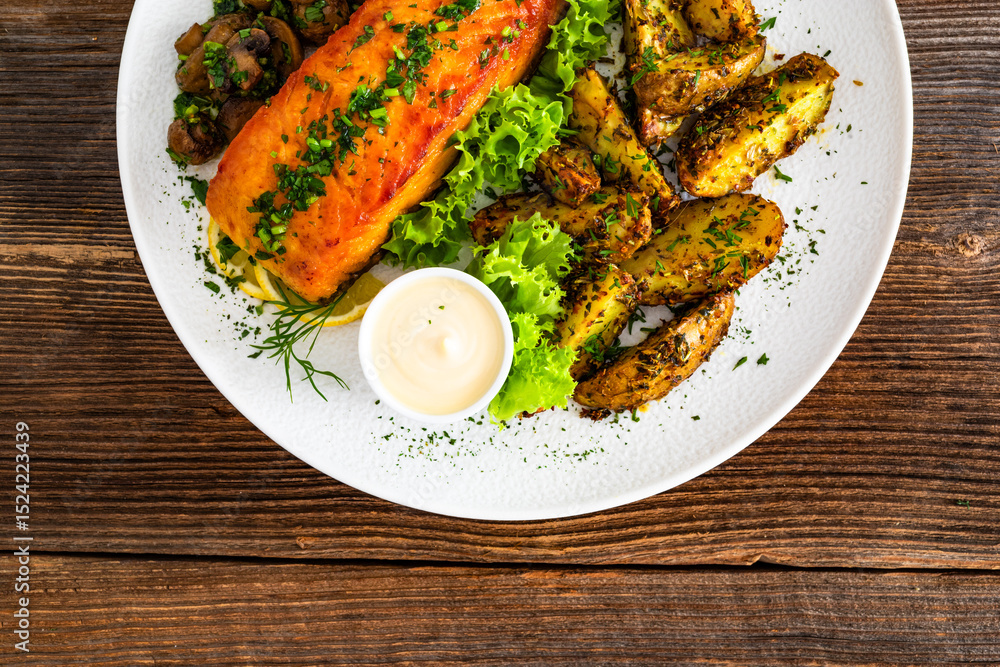 Seared salmon steak with champignons, mayonnaise and baked potatoes on wooden table