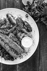 Seared salmon steak with champignons, mayonnaise and baked potatoes on wooden table