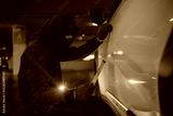 Individual engaged in suspicious activity with a laptop near a vehicle in a parking garage during night hours