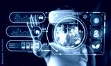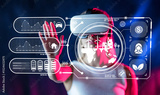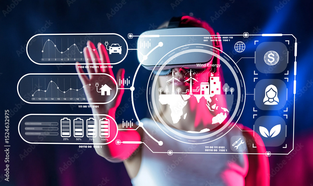 Young woman uses virtual reality headset, interacts with holographic interfaces, showcases modern technology and renewable energy concepts in a digital environment