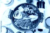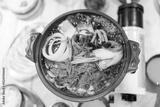 A close up of Sukiyaki meal from above, showcasing thinly sliced beef and fresh vegetables cooking in a bubbling hot pot
