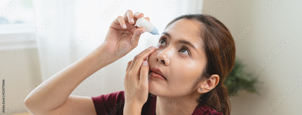 asian young woman using medical eye drops to treat dry eye and irritation.