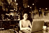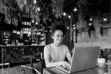 Portrait of smiling interracial female freelancer working on freelance project and looking at the laptop.
