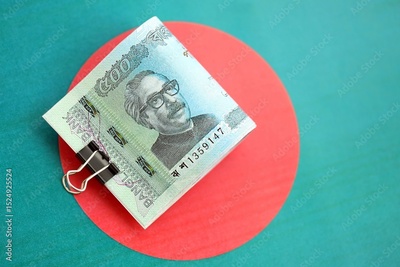 Bangladeshi taka money bills in big amount lies on Bangladesh flag close up