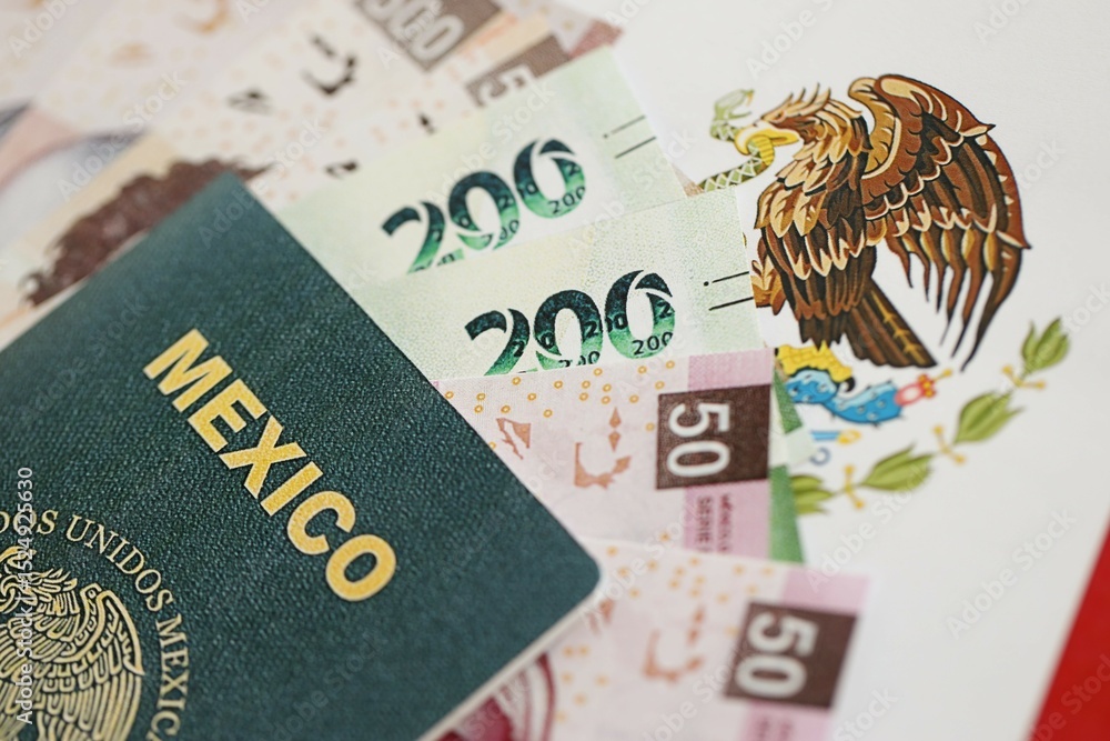 Mexican pesos money bills in big amount and passport lies on Mexico flag close up