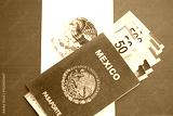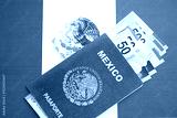 Mexican pesos money bills in big amount and passport lies on Mexico flag close up