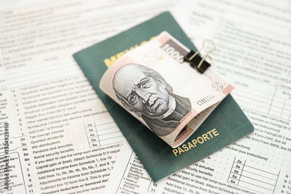 Mexican pesos money bills in big amount lies on table with passport and tax forms close up
