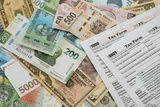 Big amount of money bills of different currencies and countries and tax report blank form ready to fill. Assortment background of international cash in big pile close up