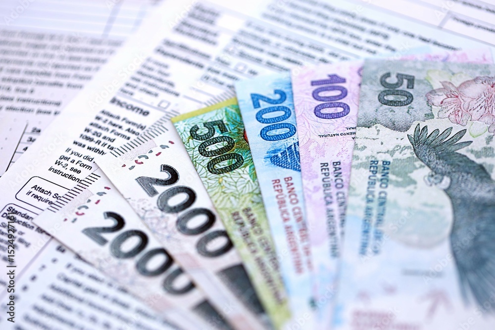 Argentine pesos money bills in big amount lies on table with pen and tax forms close up