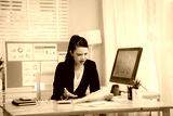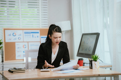 Stressed Asian businessperson sitting at desk with laptop, looking frustrated and overwhelmed by financial problems and work-related pressure indoors.