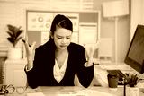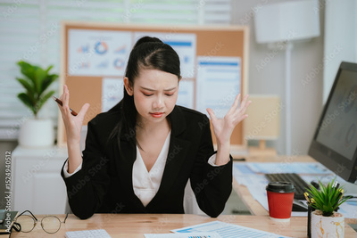 Stressed Asian businessperson sitting at desk with laptop, looking frustrated and overwhelmed by financial problems and work-related pressure indoors.