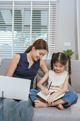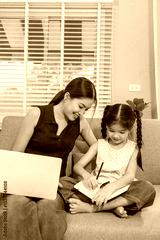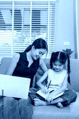 An Asian mother and daughter sit together indoors, smiling and bonding over a book, enjoying digital learning and joyful family time.
