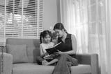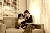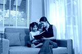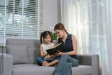 An Asian mother and daughter sit together indoors, smiling and bonding over a book, enjoying digital learning and joyful family time.