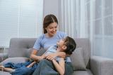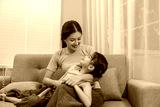 An Asian mother and daughter sit together indoors, smiling and bonding over a book, enjoying digital learning and joyful family time.