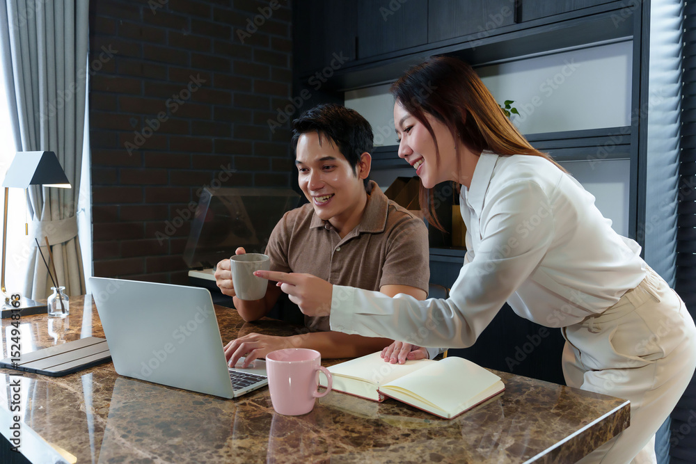 Asian Business Team Meeting and Brainstorming Ideas with Laptop & Notebooks at Workplace Sharing Coffee to Adult Man Colleague