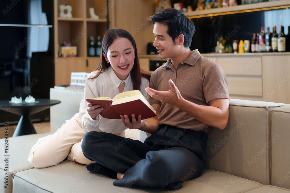 Asian Couple Reading Together at Home Sitting on Couch Enjoying Book Relaxing Indoors Beautiful Lifestyle Moments Bonding Quality Time