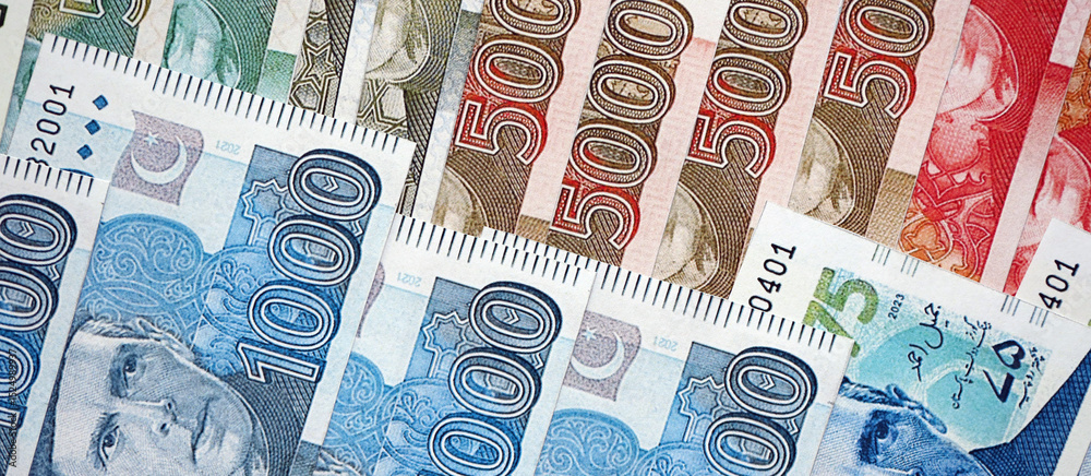 Pakistan rupees banknotes close up. The current Pakistan money bills lies on table in big amount