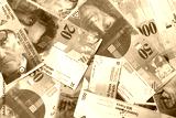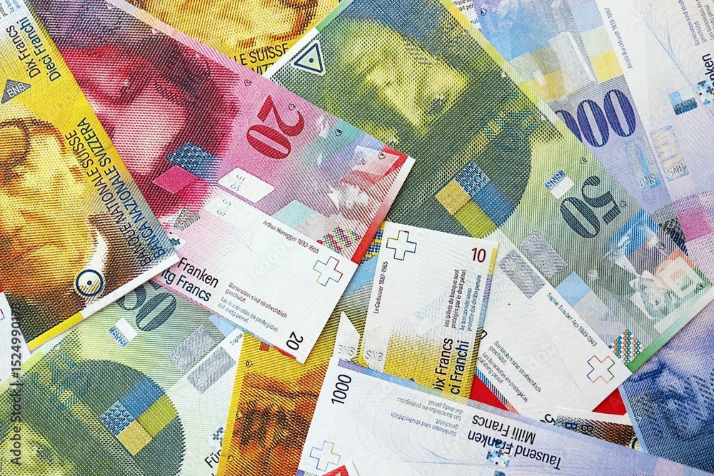 Swiss franc banknotes. The current francs money bills lies on table in big amount