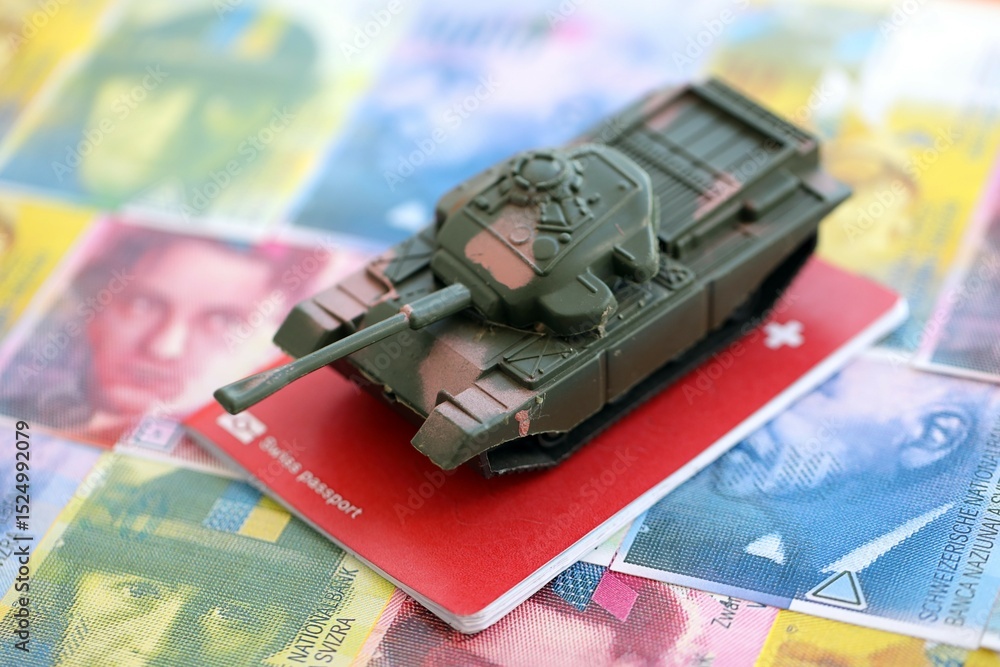 Swiss franc banknotes and toy tank on passport. The current francs money bills and tank on pass