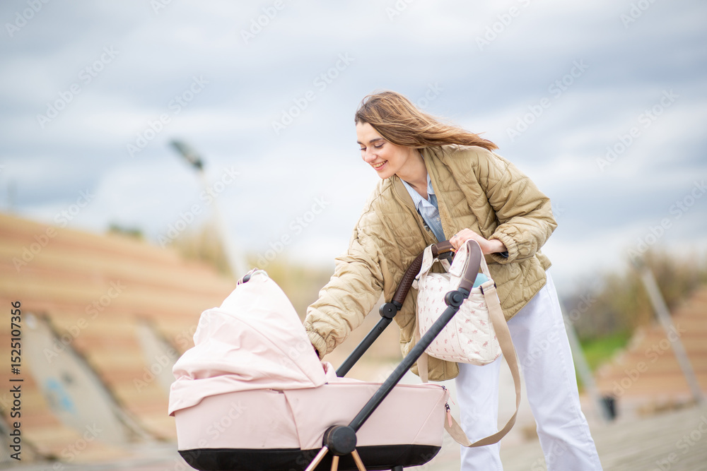 smiling young woman leans over a pink stroller to check on her baby during a walk