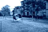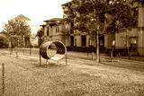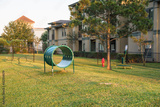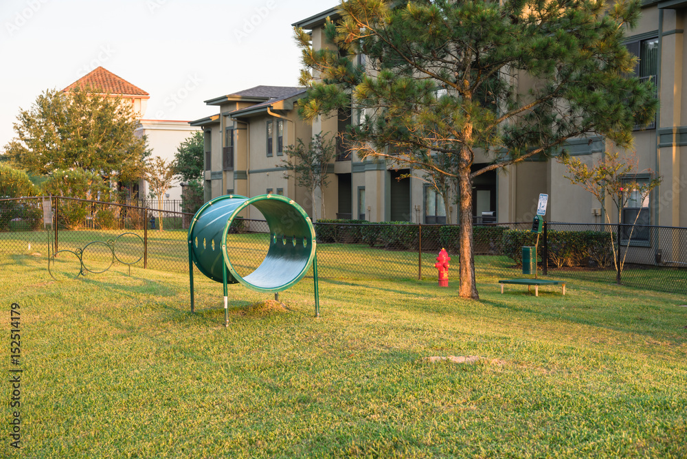 Community on-site dog park at the grassy backyard of a typical apartment complex building in suburban area at Humble, Texas, US. Off-leash dog park with pet stations, toys and bag dispensers