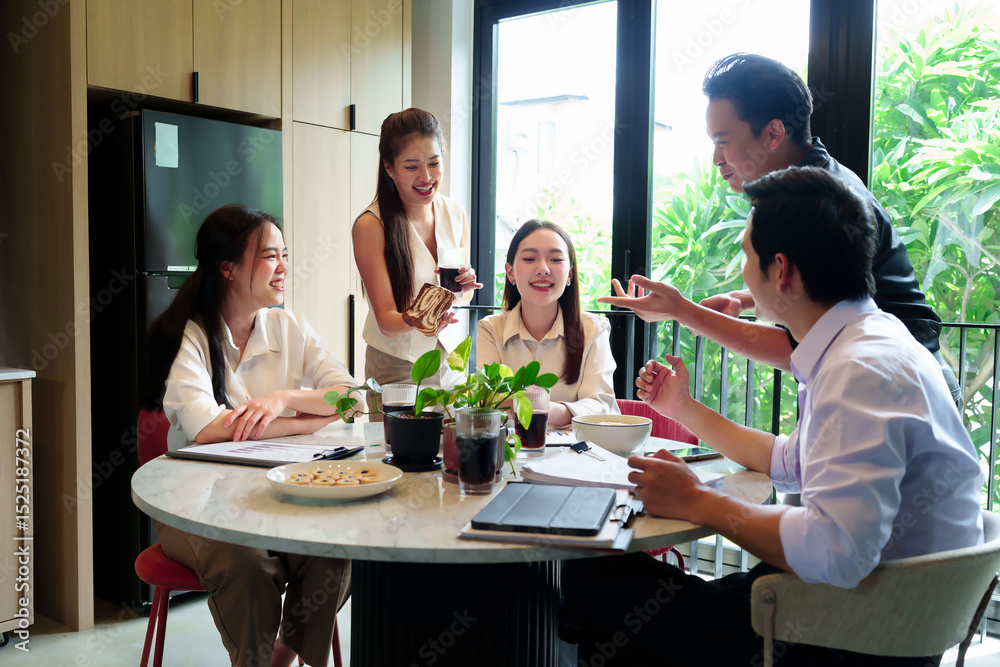Asian Business Team Having Casual Meeting with Snacks Drinks at Modern Office Table Brainstorming Ideas for Project Sharing Bread and Beverages