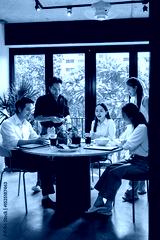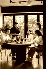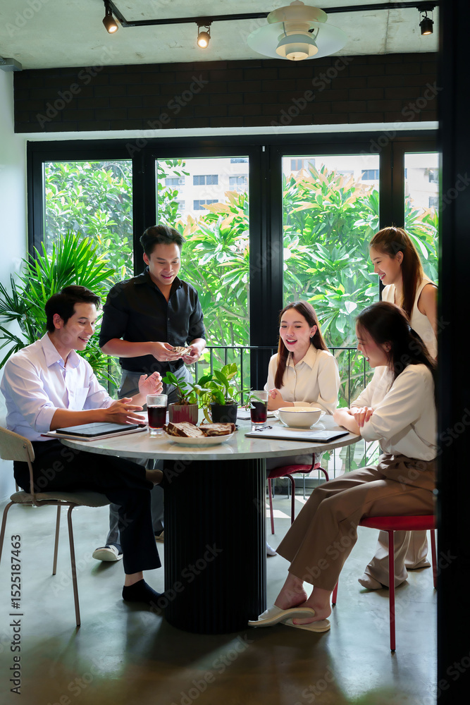 Asian Business Meeting Collaboration Teamwork at Restaurant Cafe Successful Project Casual Conversation Friendly Atmosphere Enjoying Meal Together