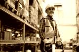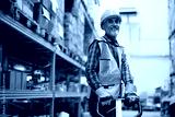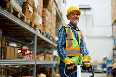 Happy senior worker pulling pallet jack in distribution warehouse.
