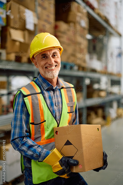Happy senior warehouse worker carrying cardboard box and looking at camera.