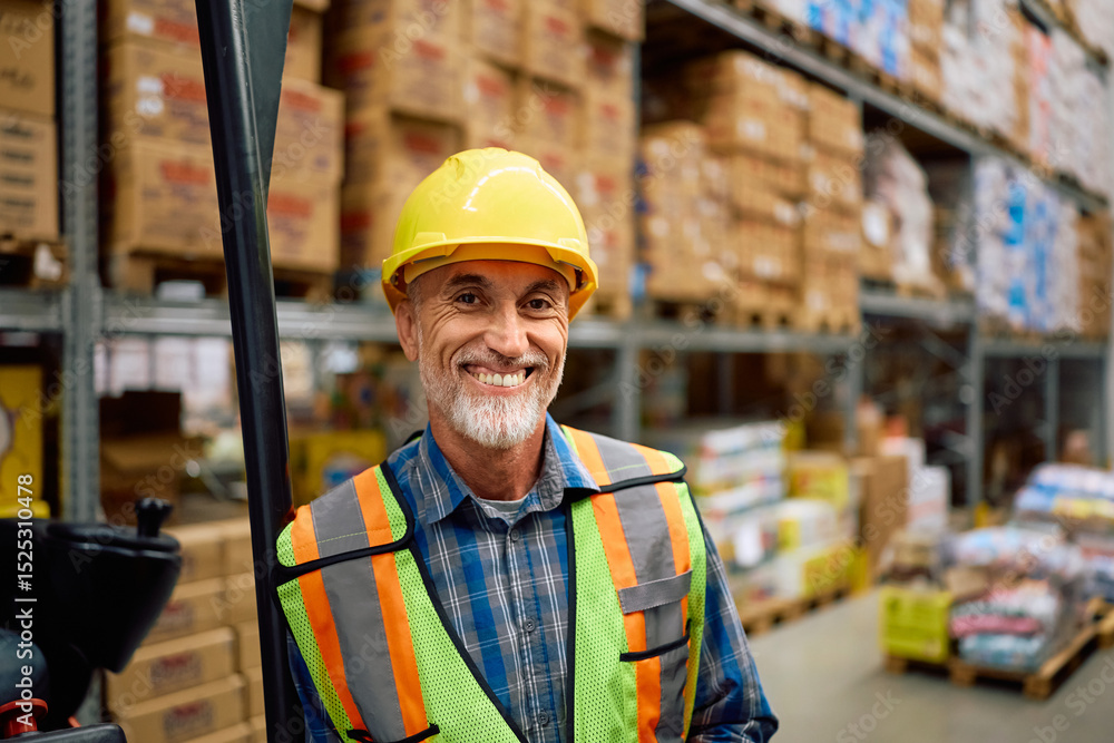 Happy senior man working as forklift operator in warehouse and looking at camera.