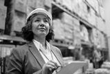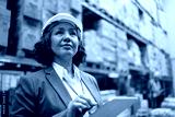 Female inspector using touchpad while working in distribution warehouse.
