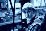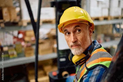 Senior worker operating forklift in reverse while loading cargo in warehouse.
