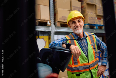 Happy senior warehouse worker by forklift looking at camera.