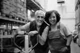 Happy senior worker and his female colleague working at distribution warehouse and looking at camera.