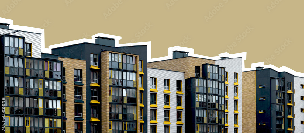 Building collage with panoramic facade in yellow, black and white. Modern apartment architecture