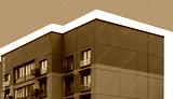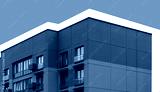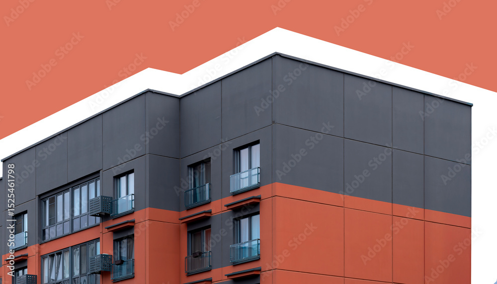 Building corner with red and gray facade featuring coral panels and geometric balconies. Modern