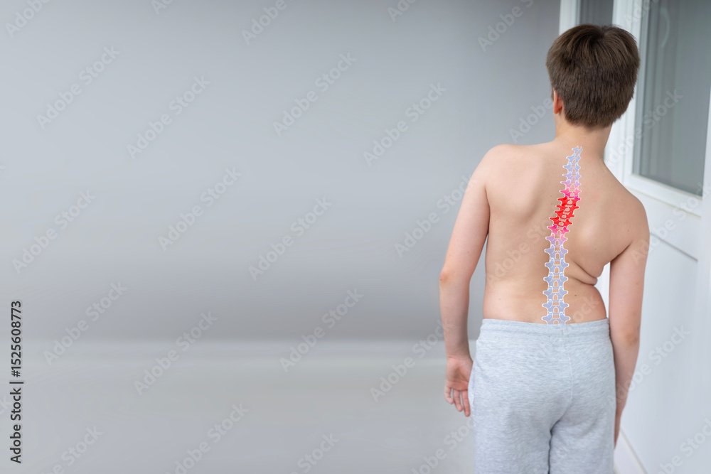 back boy, child 11-13 years old grabbed sore spot, curved spine with anatomical spine overlay, pain, therapeutic massage for osteochondrosis, scoliosis, orthopedic condition, intervertebral hernia