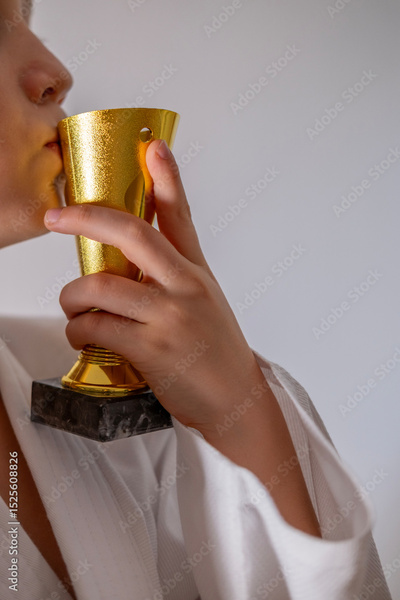 Golden trophy in hand, representing accomplishment and excellence, winning and reward, triumph and celebrating milestone, judo prize, sportsmanship triumph