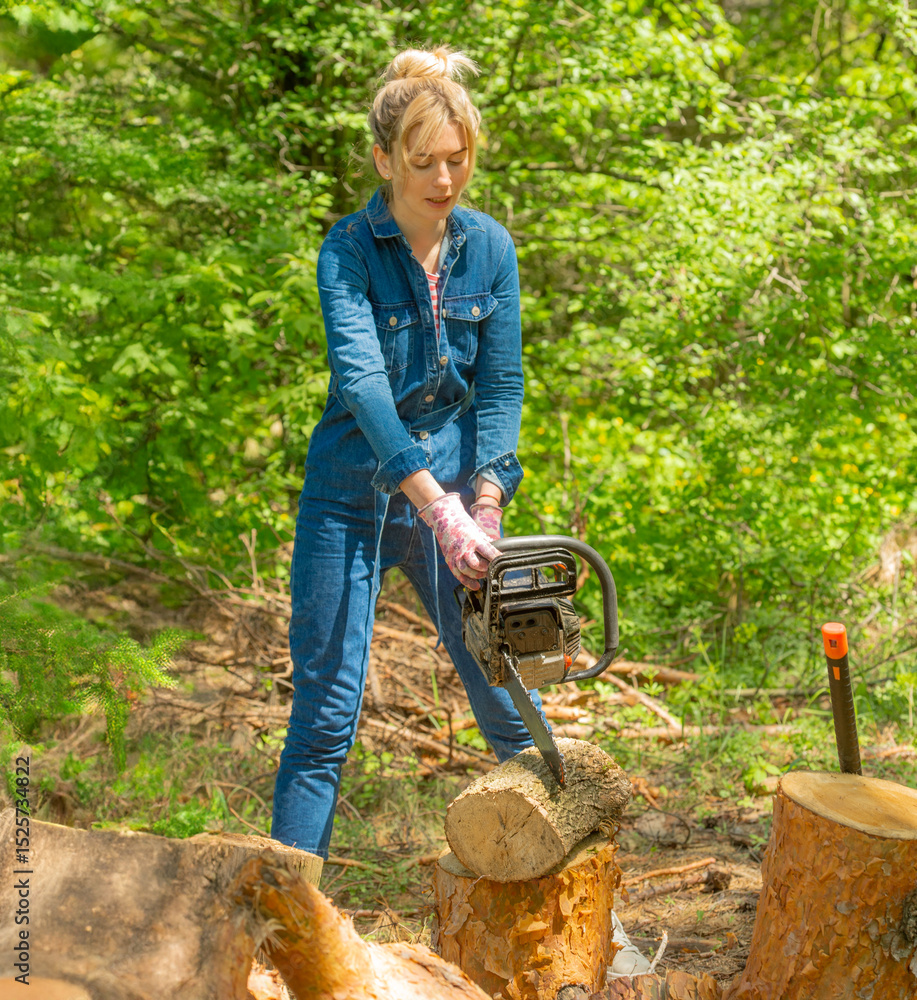 young blonde woman in denim overalls cutting logs with a chainsaw
