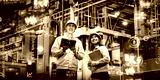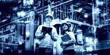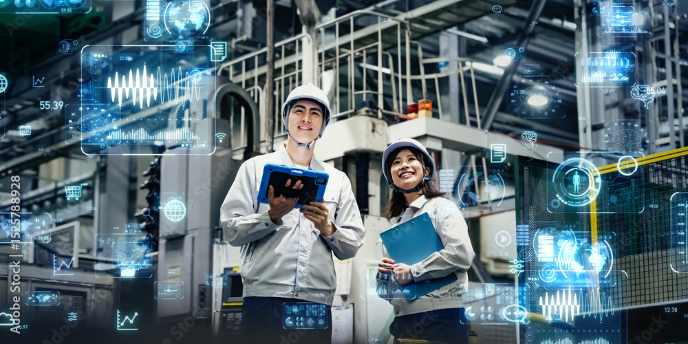 工場で作業する作業員グループとデジタルテクノロジーのコンセプト