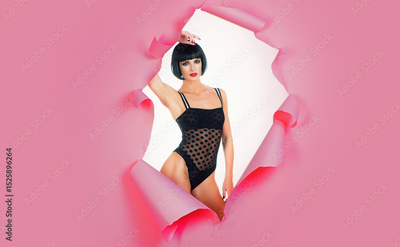 Sexy woman advertisement for sale. Sexy body fashion model in lingerie. Lingerie brand for sale. Discount poster with sexy model. Sale concept, Sexy model peeking from torn paper. Sale banner.