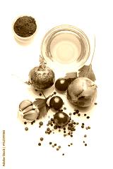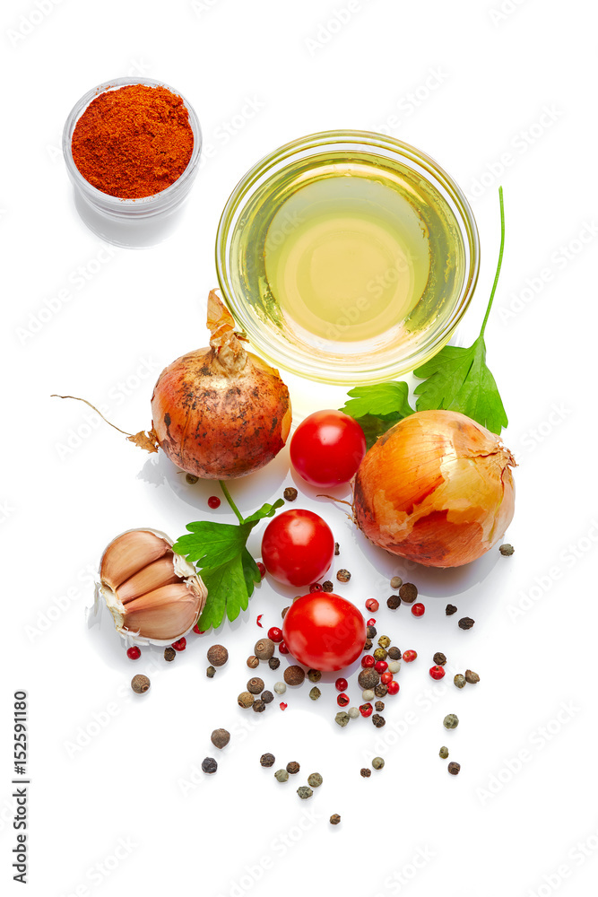 Italian food & drink healthy lifestyle concept: Mediterranean vegetables herbs & spices. Olive oil tomatoes onion garlic parsley & peppers. Top view. Isolated on white.