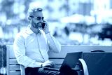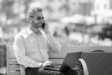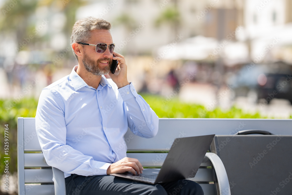Confident businessman sitting on a bench with a laptop and phone in park. Rich businessman. Mature businessman enjoying work break. Businessman taking a break on a park bench. Summer business.