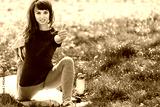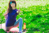 Young brunette in blue sports shirt on fitness mat doing exercises outdoors. Woman showing thumb up
