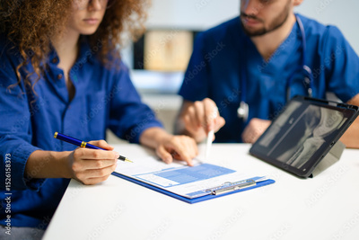 Doctor guides female patient to complete medical registration form. Concept of healthcare paperwork, consent,