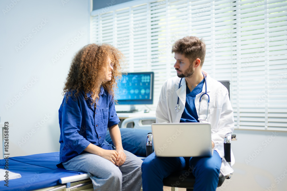 Young doctor consults female patient using a laptop in a bright clinic. Health checkup, empathy, and digital medical care