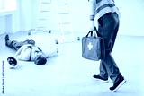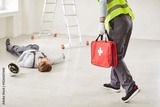 Young man worker hurrying to injured unconscious man constructor lying on the floor on building site after job accident and going to give him first aid. Emergency and safety concept.