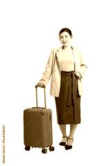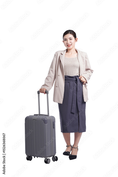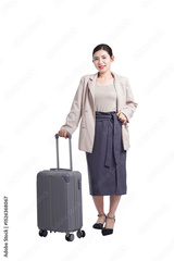 Portrait of an Asian businesswoman wearing a suit and pulling a suitcase. concept travel,go to work