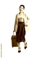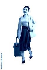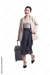 Portrait of an Asian businesswoman wearing a suit and pulling a suitcase. concept travel,go to work