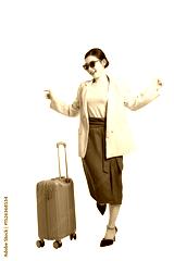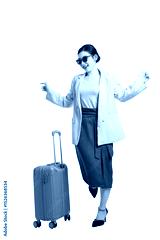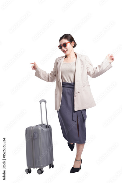 Portrait of an Asian businesswoman wearing a suit and pulling a suitcase. concept travel,go to work